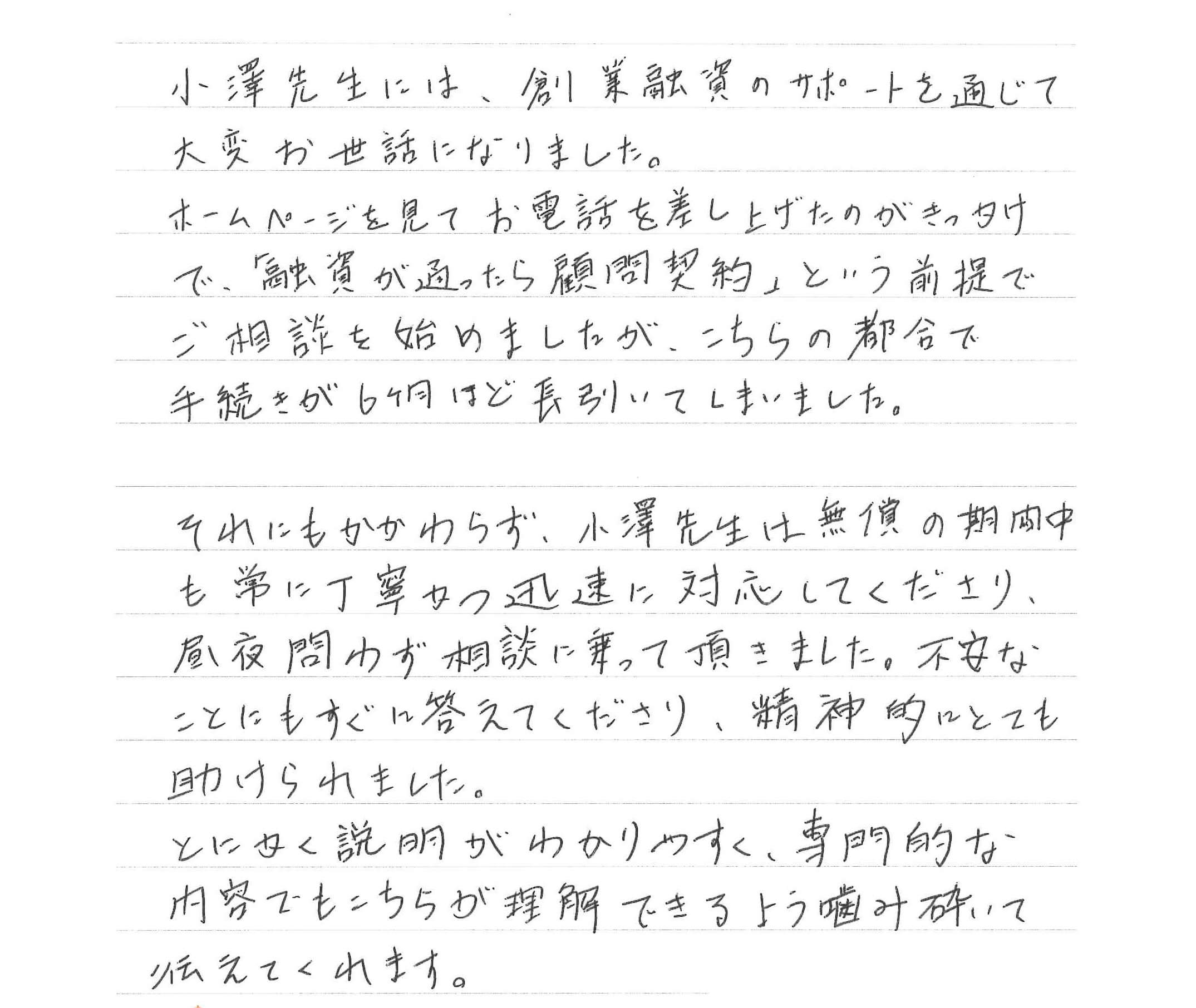 小澤先生には、創業融資のサポートを通じて大変お世話になりました。